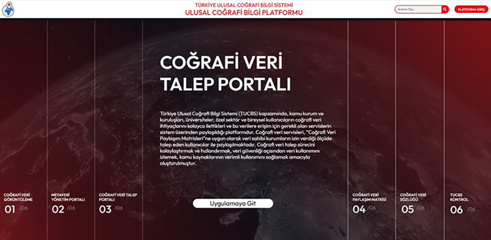 Çevre, Şehircilik ve İklim Değişikliği Bakanlığı, e-Devlet’e entegre edilen Türkiye Ulusal Coğrafi Bilgi Platformu’nu kamu kurumlarının ardından vatandaşların da kullanımına açtı. Akademik ve sektörel projeler için ihtiyaç duyulan tüm veriler bu platformla tek çatı altında toplandı. Vatandaşlar ise arsa ya da konut alım sırasında merak ettikleri coğrafi bilgilere bu sistem aracılığıyla e-Devlet’te tek tıkla ulaşabilecek.