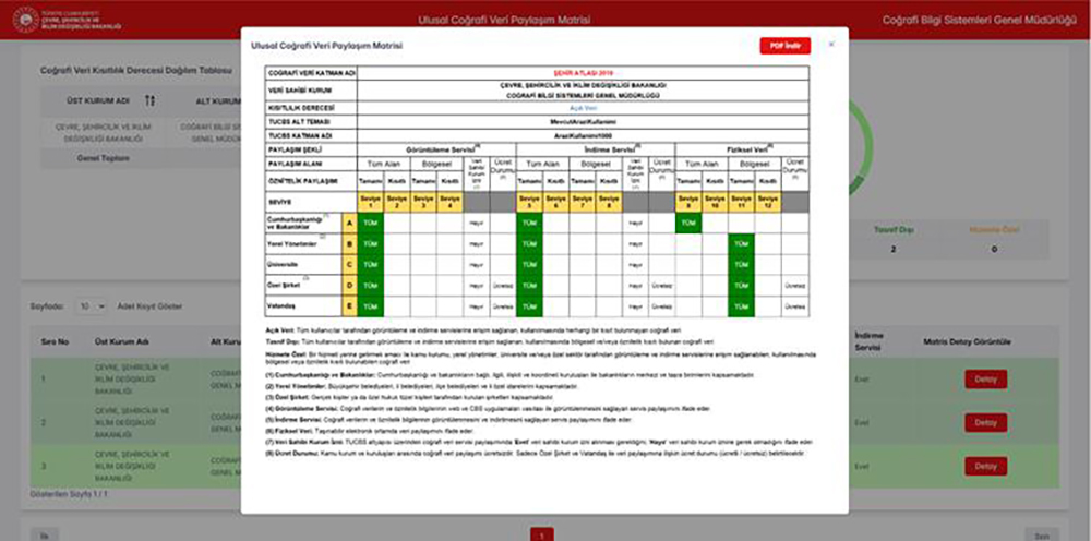 Coğrafi Veri Paylaşım Matrisleri veri sahibi kurum tarafından oluşturularak Ulusal Coğrafi Bilgi Platformu’nu kullanan kullanıcıların yetki düzeyine göre erişime açılıyor. Kimin hangi veriye ulaşabileceğini veri sahibi kurum belirleyip denetliyor. Böylece stratejik verilerin güvenliği sağlanıyor.